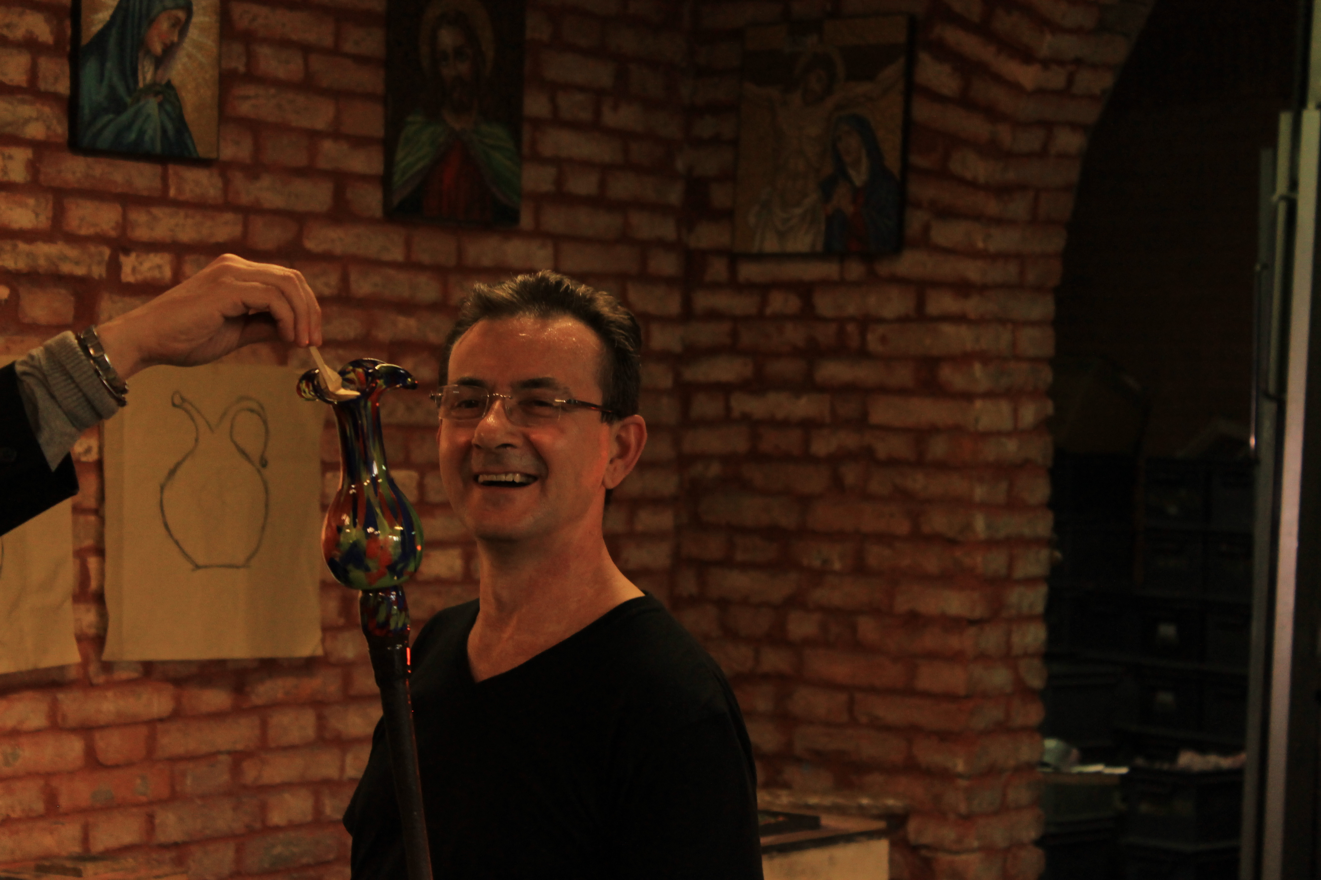 While I was waiting for Kim during breakfast I ended up striking a conversation with two guys that had just got into Venezia the night before. One of them was a Brazilian named Paolo that was at the end of a 4 week Europe adventure and the other was an American named Keaton that had just started and was traveling for another 4 weeks. They both ended up joining Kim and I as we went to visit Murano (the island famous for glass working) and Burano (famous for having cute colored houses.) Actually Burano had been a suggestion from a family friend so thanks Revathi Aunty if you’re reading! Once we got to Murano we got to see a pretty cool display of a master blowing some glass into a dolphin and a vase.