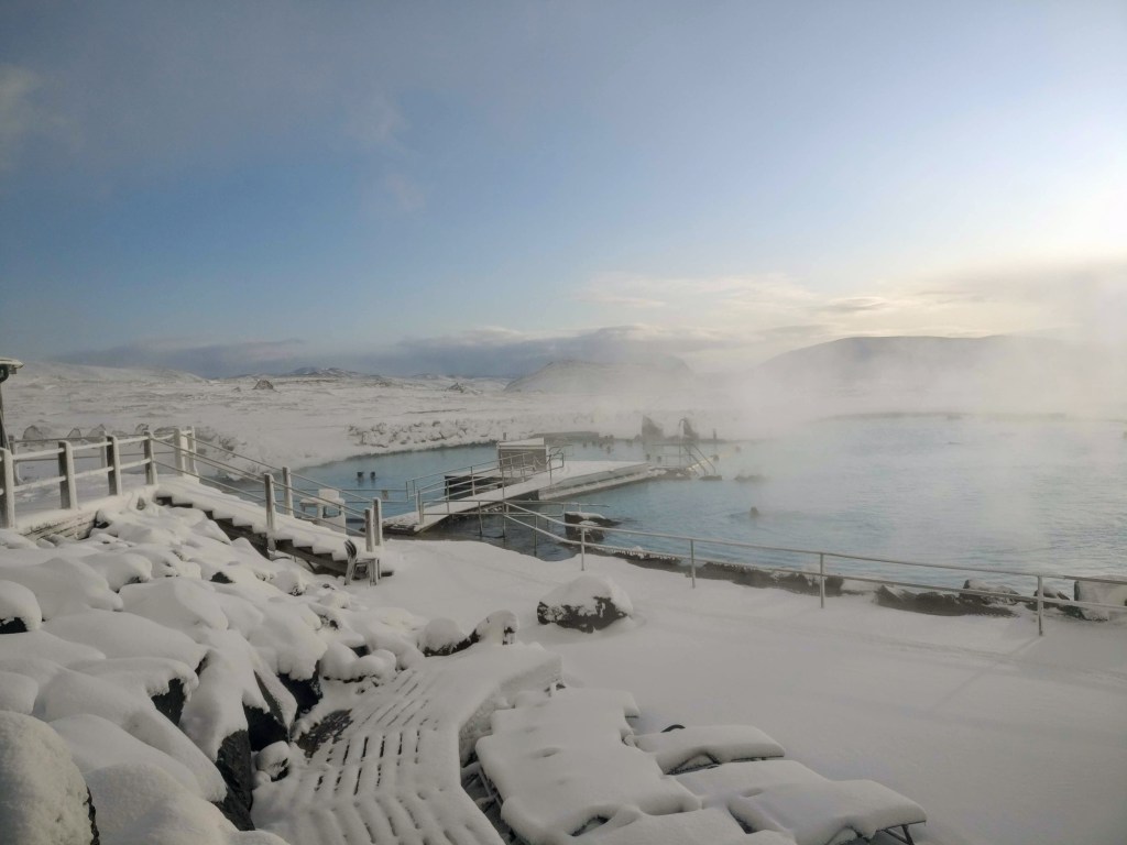 This day we woke up to snow and some roads with snow cover. We decided to tentatively push forward hoping that the northern mountain roads wouldn’t be too icy or get closed due to inclement weather. We roads were quite precarious but we were able to make our way to the Myvatn Geothermal area which has volcanic craters, colorful mud pools and geysers. The whole area looks like it is smoking, has a distinct sulfurous smell and is one of the most obvious examples of the volcanic activity in Iceland. We took a nice soak in the hot spring there where you can soak in the Myvatn Nature Bath for a fraction of the price of the more popular Blue Lagoon. It was incredible to be in our swimsuits in a natural hotspring while snow was falling all around us.