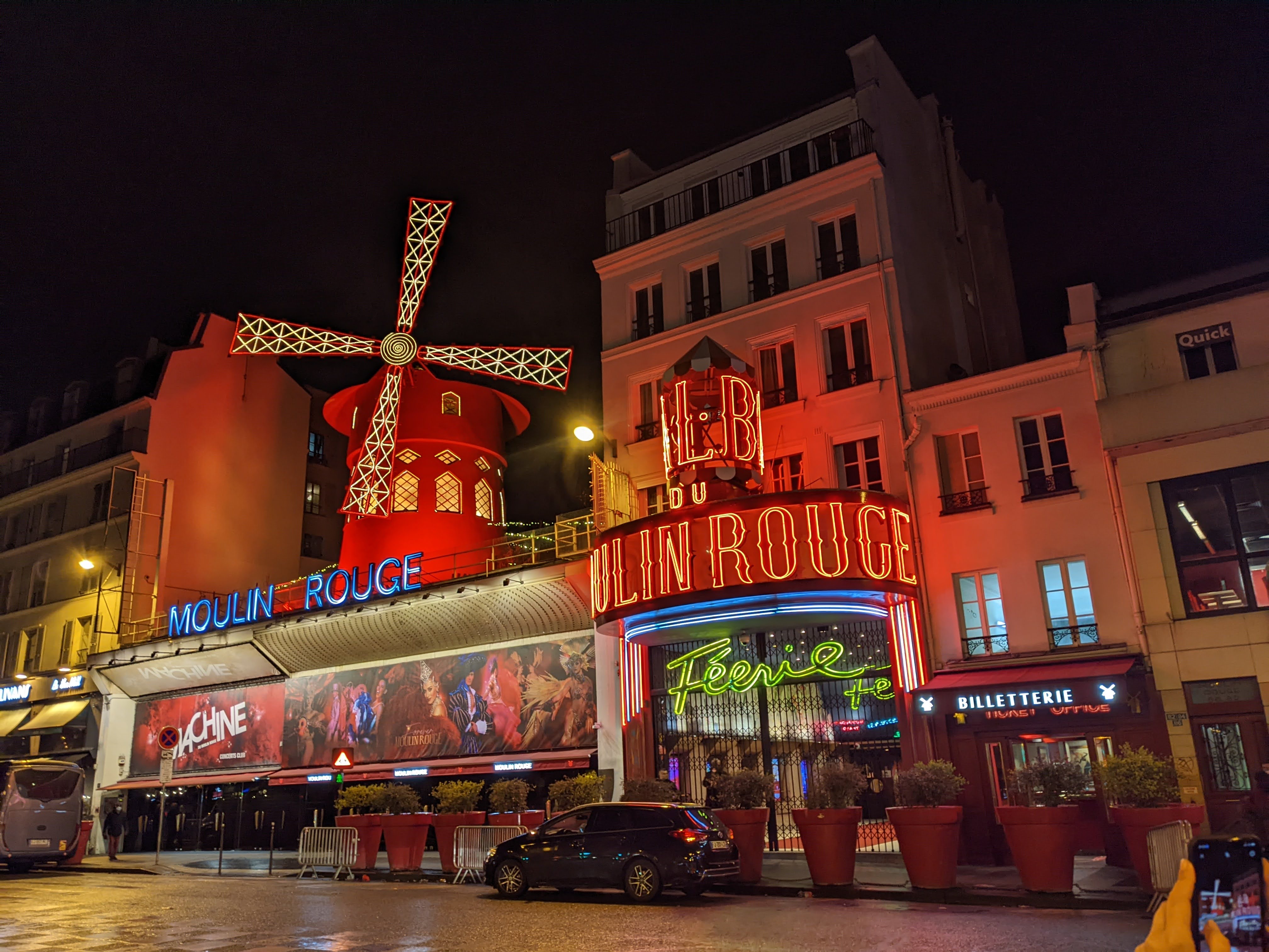 After our late night on the town we got off to a late start on Day 4 but had planned a more relaxed day around the Montmartre neighborhood since our feet were pretty tired after three days of walking nonstop. Montmartre is a neighborhood that once was a village on top of a hill that got swallowed by Paris that still has charming cobblestone streets and an artistic history. We kicked off our day with delicious crepes from Crêperie Brocéliande where the 13 euro fixed breakfast menu includes coffee a savory crepe and a sweet crepe. With full stomachs we climbed the steep stairs up to Sacré-Cœur where we took in the incredible views of the city and experienced the beautiful Sunday mass ceremony. In the square outside the basilica we watched some incredible artists creating beautiful works outside. Then we wandered in and out of the little shops in the neighborhood buying souvenirs and taking a little afternoon coffee break. For dinner we ate at the Le Moulin de la Gallette, a restaurant with a windmill similar to Moulin Rouge. This was our allocated fancy meal for the trip and the food did not disappoint. While I had creamy pasta my non-vegetarian friends tried snails for the first time. With full bellies we decided to try to walk past Moulin Rouge on our way back to the train station. This iconic landmark was definitely exactly what I pictured when I watched the movie.