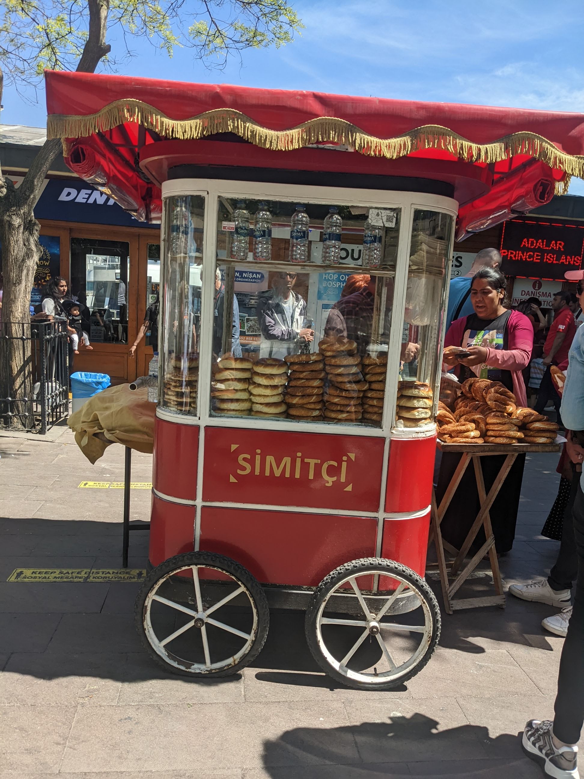 My favorite Turkish food was by far the Full Turkish Breakfast. Usually consisting of eggs cooked several ways, fresh pita, cheeses, cucumbers and tomotoes as well as filled savory pastries; it is a true celebration of Turkish cuisine. We one at a restaurant near the Hagia Sofia but also had a less formal one everyday at our hotel The Ferman which provided breakfast on their beautiful rooftop. Another Turkish delicacy I really enjoyed was the Simit, a circular bagel-like bread covered in sesame seeds and could be filled with cream cheese or nutella. We got a few of them from streetcarts that can be found on several streets. Last but not least we had several mezze platters which as a vegetarian were my favorite non-breakfast food to eat while in Istanbul. Usually consisting of several dips, veggies and pita these were super delicious and can be found at almost every restaurant in Istanbul.