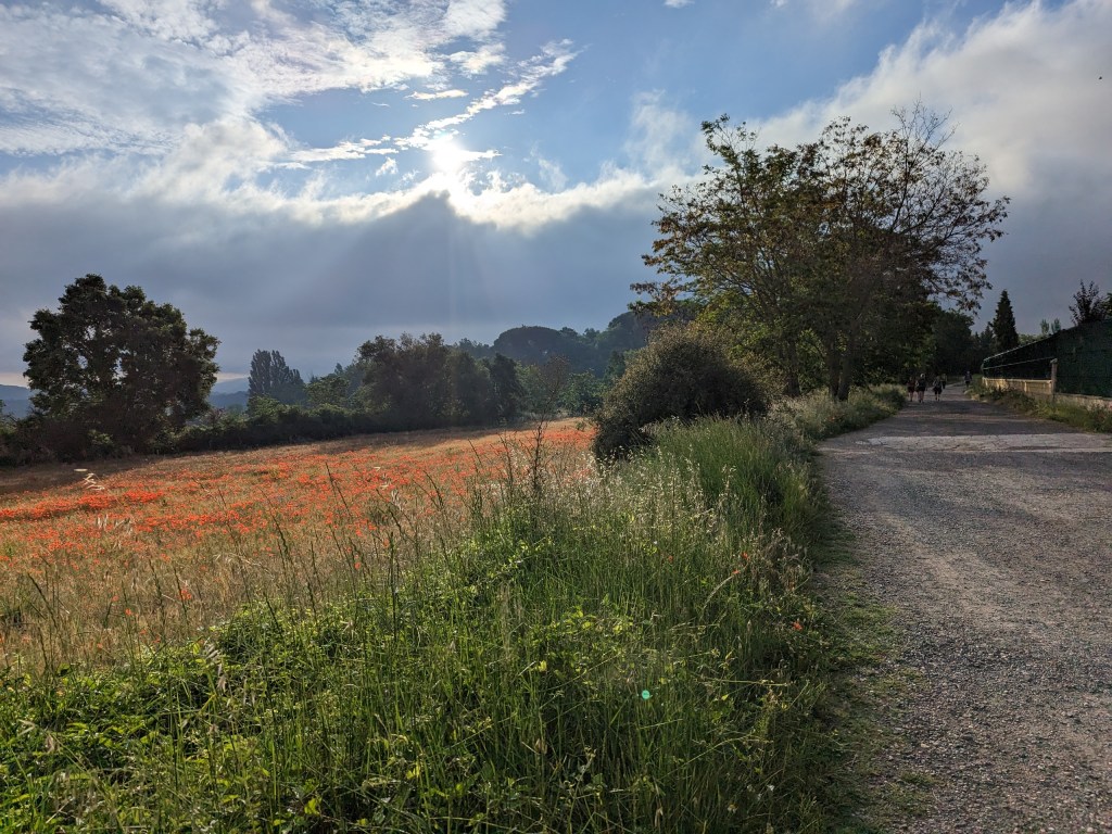 After Estella the landscape changed from the Mountains of the Pyrenees to rolling hills of vineyards and wheat fields. We passed the famous Irache Wine Fountain where pilgrims can fill up their bottles with free Rioja wine. We walked by the fountain at 8 am in the morning so decided to just take a sip and fill my 500ml bottle to enjoy the wine later. While the wine fountain was really cool, I will admit that the wine itself was not my favorite. But what can you expect from a free fountain? While this region was beautiful, there was less shade and it could get hot if we walked in the afternoon so we tried to leave early enough to avoid walking after 2pm if possible. The most unexpectedly beautiful part of this walk was passing fields of red poppies along the way. We got a real sense of spring blooming while we were walking in early June.